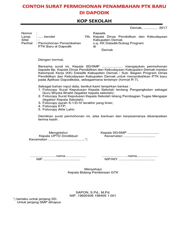 Contoh format surat permohonan penambahan ptk baru pada aplikasi dapodik dapat.
